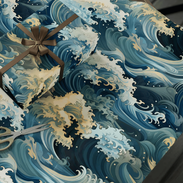 Blue Great Wave Wrapping Paper for birthdays and Christmas—Kanagawa wave design with ocean waves crashing. Perfect for adding a dramatic touch to your gift presentation.